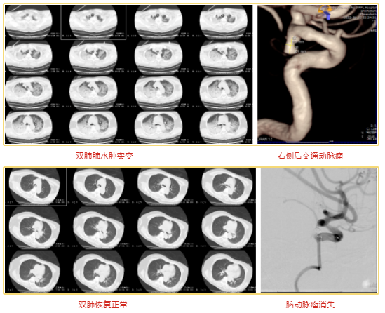 今年6月,家住咸宁59岁的张阿姨因突发昏迷被送往当地县医院,经头颅CT检查提示为蛛网膜下腔出血、脑积水,便立即转往当地市中心医院,经确诊为脑动脉瘤破裂出血,并随时有再次破裂出血致命的可能。不仅如此,患者因脑动脉瘤破裂出血后导致颅内压急剧升高引起肺部严重并发症,继发爆发性神经源性肺水肿,双肺实变,失去正常呼吸及氧气交换功能,行气管插管呼吸机辅助呼吸仍提示全身缺氧,病情十分危重,医生建议转往上级医院。回忆当时的场景,张阿姨的老伴说:“当时病情太重,转院与不转院均有生命危险,思考再三,抱着拼命一搏的想法,多方打听后,我们决定转往湖北中山脑血管病医院,别人都说那里治得好”。