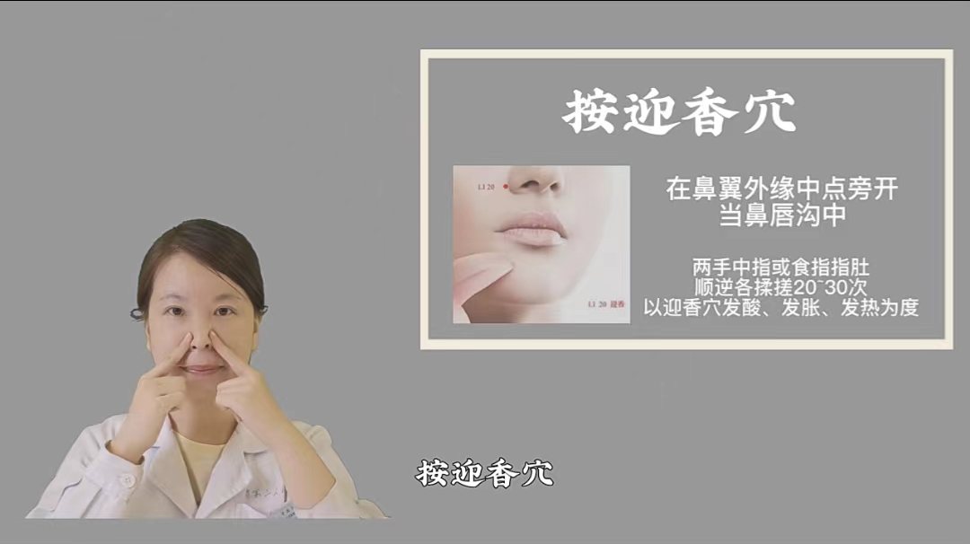 二是按迎香穴润肺防燥。冬燥容易危害肺脏。点揉迎香穴具有清热散风、祛燥润肺、宣通鼻窍的作用;迎香穴位于鼻翼外缘约0.5寸、鼻唇沟中。两手中指或食指指肚,顺逆各揉搓20~30次,以迎香穴发酸、发胀、发热为度。