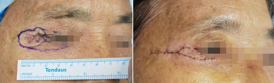 最终,刘坤为李婆婆确定了手术方案——右侧眼睑肿物切除术+皮瓣转移术,在肿物完整切除的同时,保证肿物周围的器官没有明显的变形,同时利用美容缝合技术,确保患者术后疤痕不明显。在手术中,由于患者面部皮肤衰老,上下睑皮肤有明显松弛,刘坤利用下睑皮肤的风筝皮瓣来覆盖主要的创面,上睑利用一个推进皮瓣覆盖次要创面,外侧通过切口延长修剪“猫耳朵”,通过这种无痕技术从而让疤痕不那么明显,再结合术后护理和术后的抗疤痕治疗,让疤痕进一步淡化,经过两个小时的手术,肿物完整切除,如今李婆婆恢复情况良好。
