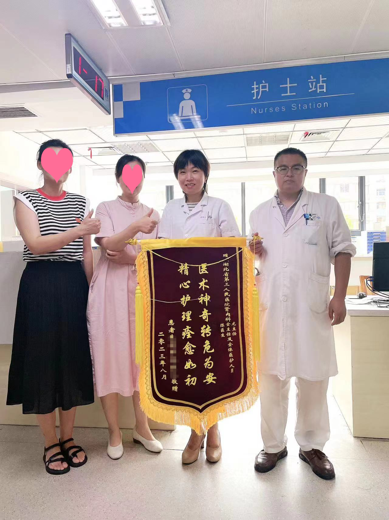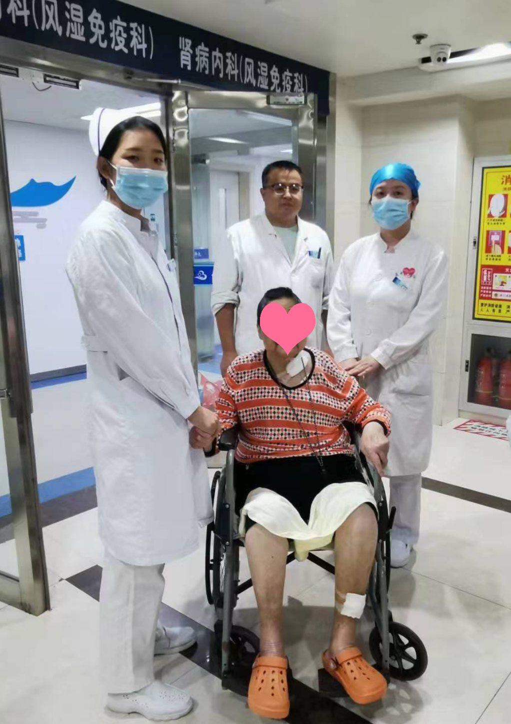 “医术神奇转危为安,精心护理痊愈如初”出院前,朱婆婆及家属将特地定制的锦旗送到肾病内科(风湿免疫科),向该科主任龙利及全体医护表示感谢。“这次真是捡回了一条命,感谢省第三人民医院,感谢龙主任!”