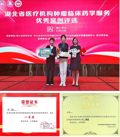 经过专家评委和大众评委的现场打分,最终陈敏药师案例以小组第一的成绩荣获本次比赛的“一等奖”。此外,2023年10月15日,在2023年湖北省药物流行病及药物评价专业委员会学术年会举办的《湖北省药源性疾病案例比赛》评比中,陈敏药师提交的案例荣获“二等奖”。