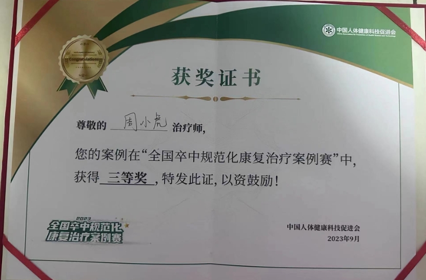 【喜报】湖北省第三人民医院康复医学中心周小虎荣获2023全国卒中规范化康复治疗案例大赛第三名
