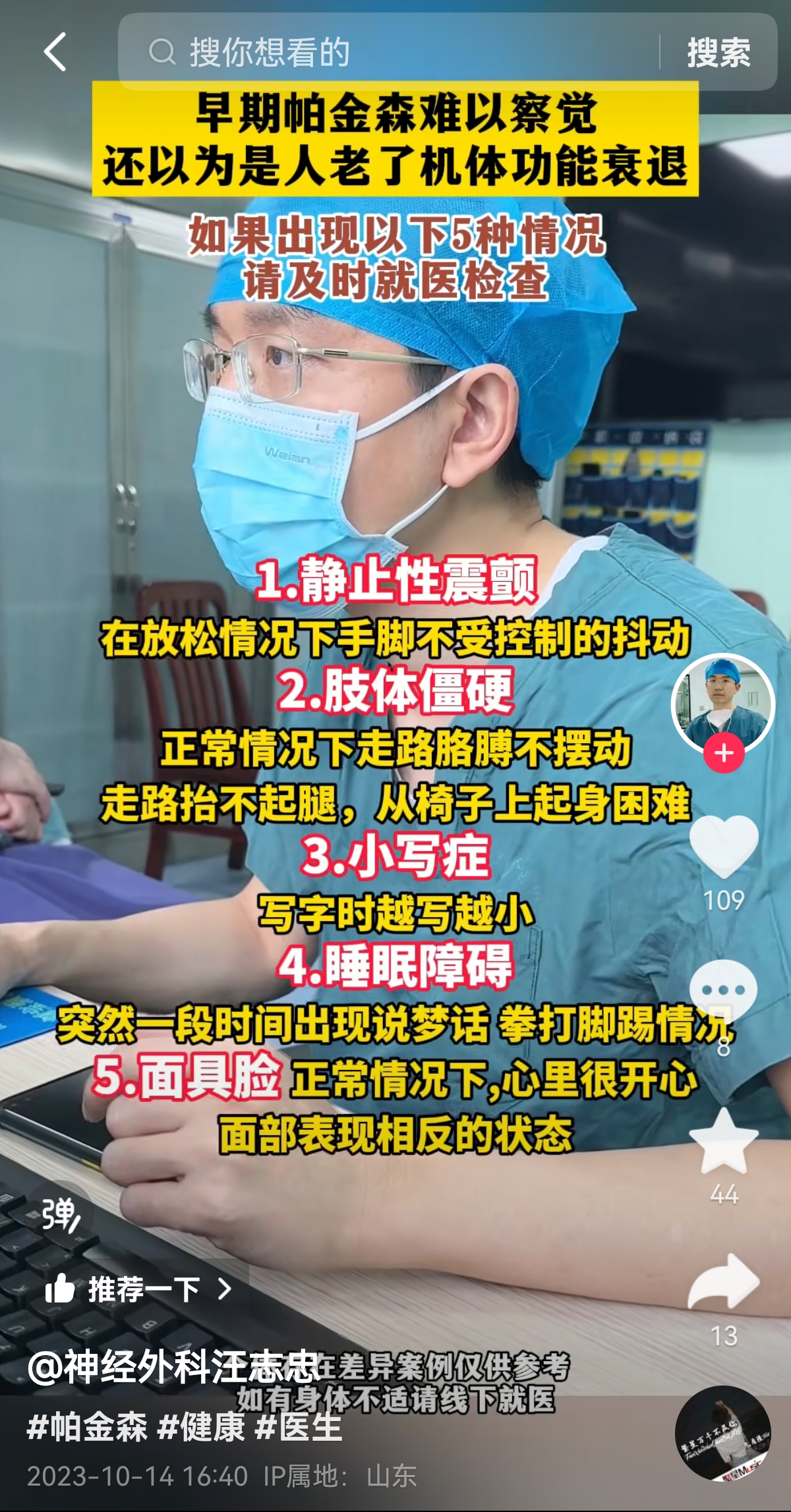 原来,家住哈尔滨的65岁谭爹爹于两年前出现无明显诱因左上肢震颤,后来左下肢也出现了相同症状,一开始爹爹也没有太在意,但是随着病情发展,肢体抖动越来越频繁,严重影响其生活质量。为了治疗,谭爹爹在当地看了不少医生,甚至去过北京看病,药吃了不少,但是收效甚微。一次偶然的机会,爹爹在抖音里刷到湖北中山脑血管病医院神经外科副主任医师汪志忠的视频,汪志忠对于帕金森的相关知识进行科普,讲解的内容细致又实用,抱着试一试的心态,谭爹爹决定不远千里来到武汉就医。