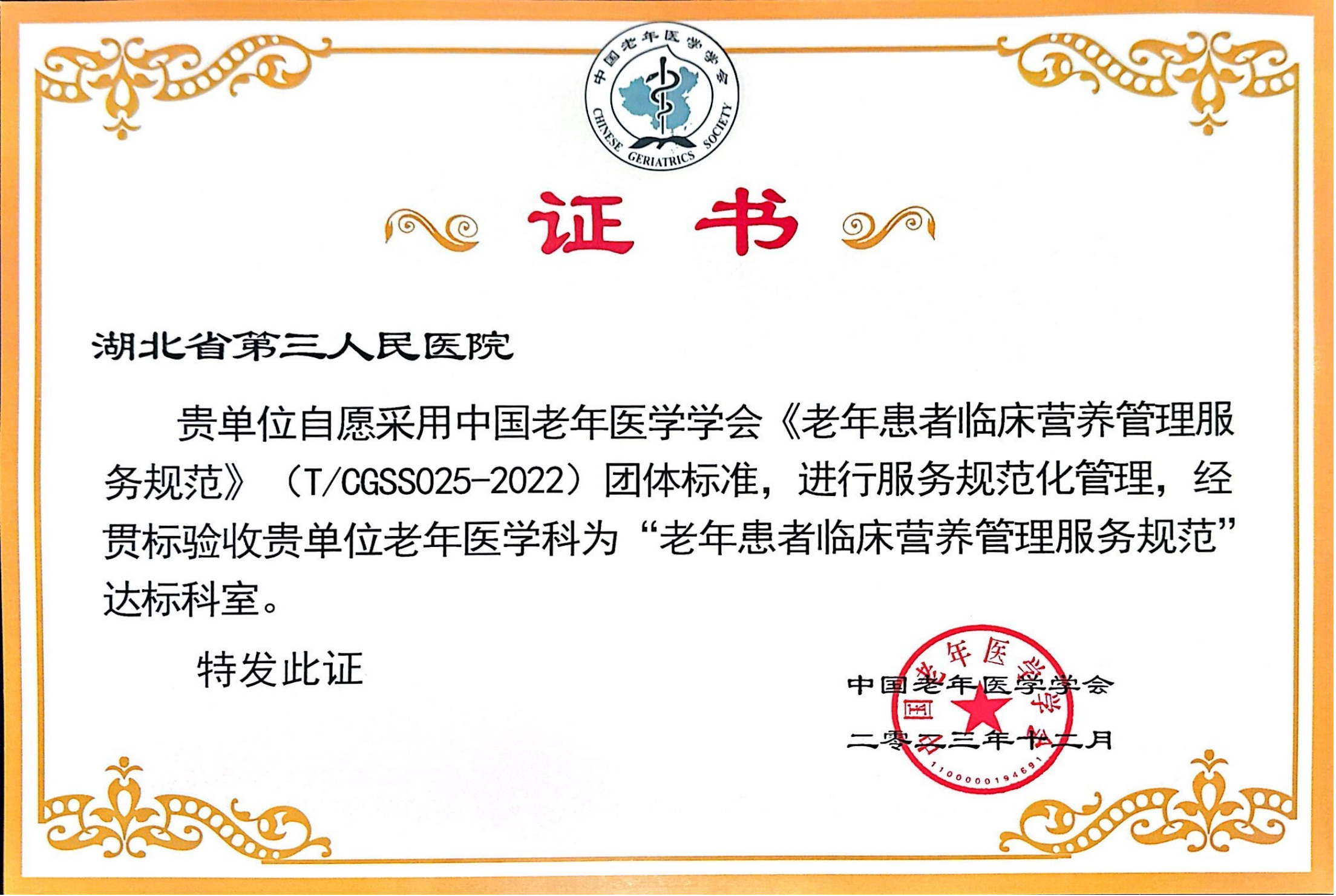 12月2日至3日,第十三届全国老年医院联盟大会中国老年医学学会老年医疗机构管理分会年会暨老年医疗机构高质量发展研讨会在自贡举行。会上对评选出的老年营养规范病房颁发了证书,其中,我院全科医学科(老年病科)被评为“老年患者临床营养管理服务规范”达标科室并获批“老年营养示范病房”荣誉称号。这一殊荣标志该科在老年医疗服务领域取了重要突破,能为老年患者提供更全面和个性化的营养支持及护理,以促进康复和提升老年人晚期生活质量。