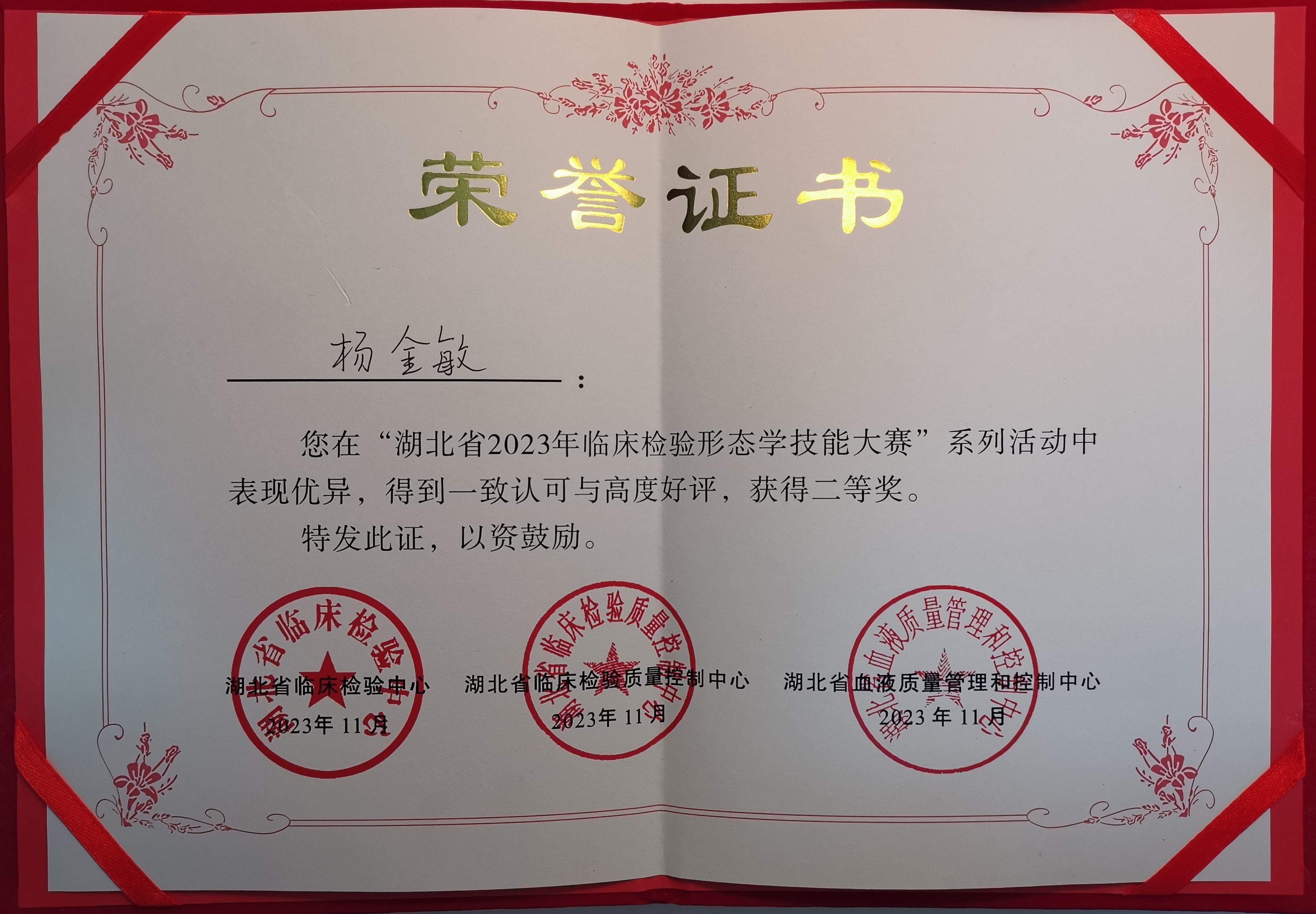 近日,由湖北省临床检验中心、湖北省临床检验质量控制中心、湖北省血液质量管理和控制中心联合中华医学会杂志社、中华检验医学杂志编辑委员会举办的湖北省首届临床检验形态学技能大赛在武汉圆满落幕。湖北省第三人民医院(湖北省中山医院)阳逻院区检验科杨金敏在该技能大赛中积极应对,发挥出色,荣获个人二等奖。
