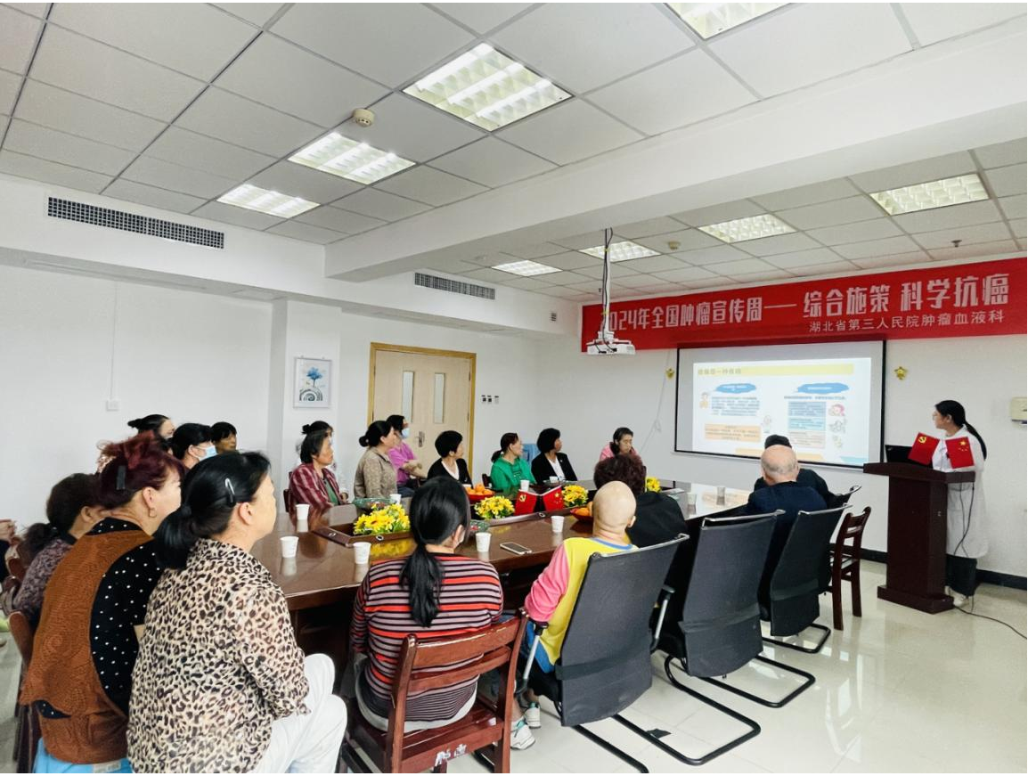 今年4月15至4月21日是第30个全国肿瘤防治宣传周,本次宣传周的主题是“综合施策,科学防癌”,旨在倡导每个人做自己健康的第一责任人,普及抗癌健康知识,降低癌症危害。为了加强公众对肿瘤的认知,提高早期筛查和防治意识,4月15日,湖北省第三人民(湖北省中山医院)肿瘤血液科在病区举办了肿瘤相关知识的健康宣教座谈活动。副主任医师晏菲及医护人员以科普讲座、现场健康咨询、播放视频等多种形式,全方位、多层面开展活动。为了更好的让患者了解癌痛相关知识,严倩倩医师以“癌痛“为主题,向患者讲解难治性癌痛最新治疗方案等,语言通俗易懂,内容丰富实用。肿瘤血液科一区护士长杜志琼对肿瘤患者营养摄入进行讲解及解答。