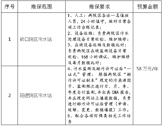 根据我院两院区污水站运维服务项目需求,拟立项招标两院区污水站运维服务项目,现将相关要求公布如下,欢迎有意向、符合条件的企业积极报名。
