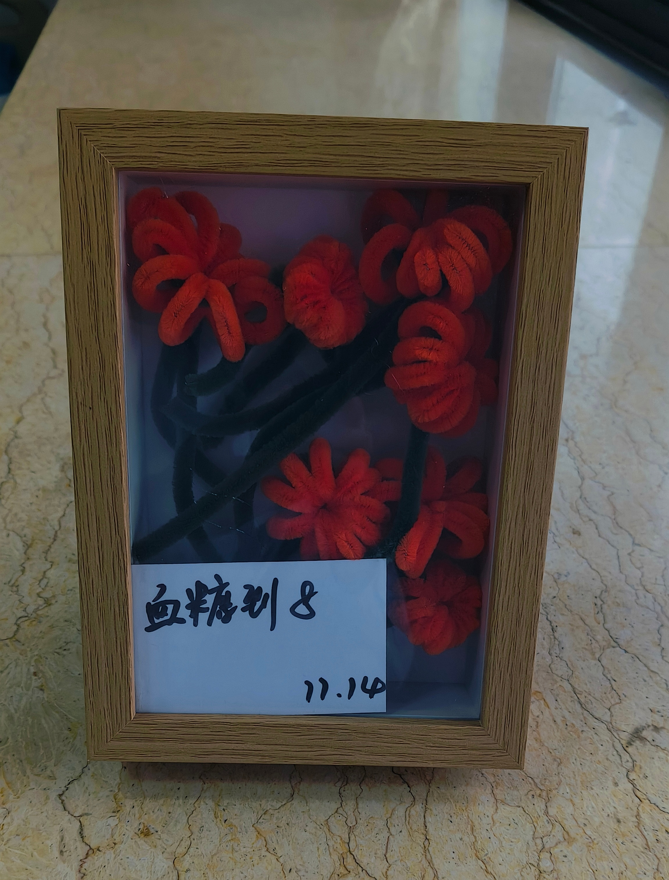 最令人暖心的环节是“创意工作坊”。糖友们拿起扭扭棒,通过绕一绕、拧一拧,一个个圆滚滚、红彤彤的“小柿子”便在手中诞生,再将这些“小柿子”拼成相框,寓意着“事事如意”。大家还纷纷在相框里写下自己的健康心愿,有人写着“下个月血糖降到7以下”,有人写着“每天多走1000步”,小小的相框里,满是对健康的期待,原本严肃的健康管理,瞬间变得温暖又直观。一位阿姨举着自己亲手制作的柿子相框,笑容格外灿烂,她感慨道:“以前听控糖课总犯困,这次又玩又学,太开心了。”更贴心的是,每位参与者都领到了一份专属健康礼包,里面不仅有图文并茂的科普手册,方便随时查阅,还有能随时测腰围的腹围尺,以及方便装降糖药的小药盒。