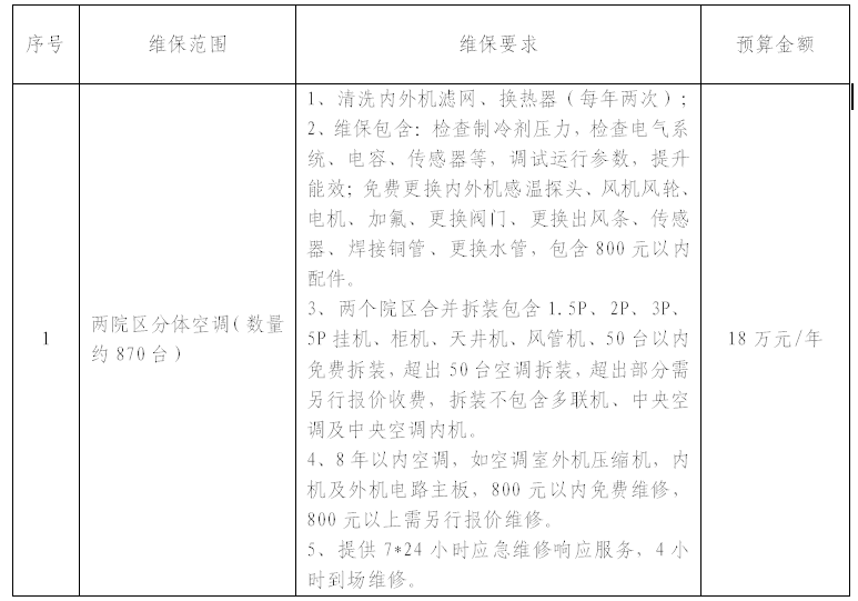 4.服务要求:空调定期维保、补氟、清洗,提供7×24小时应急维修响应,4小时内到场维修。